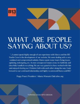 “…I cannot speak highly enough of our experience with Marco and the B13 Studio Crew in the development of our website. We were dealing with a very outdated and compromised website. Marco spent many hours fixing issues, updating, redesigning, etc. As new unexpected issues arose, he faithfully and cheerfully handled everything. We are very grateful to have worked with him and enjoyed sharing our Christian faith with each other along the way. I look forward to our continued relationship and highly recommend Marco and B13.”